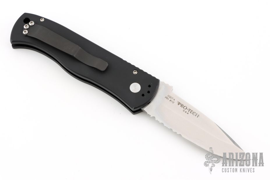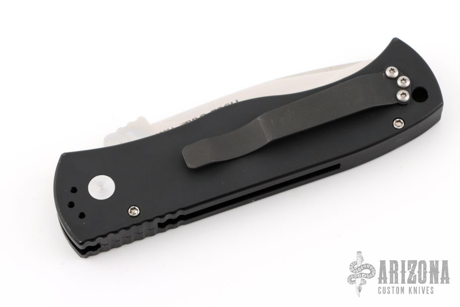 This Emerson/Pro-Tech CQC7 automatic features a stonewash spear point blade with serrations and a black aluminum handle. Matching clip and hardware. Coil spring. PR1 #112. Has a couple light scuffs and scratches, great condition otherwise.