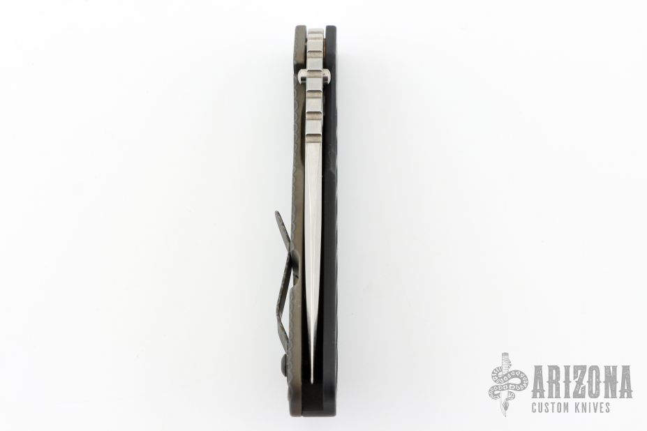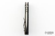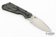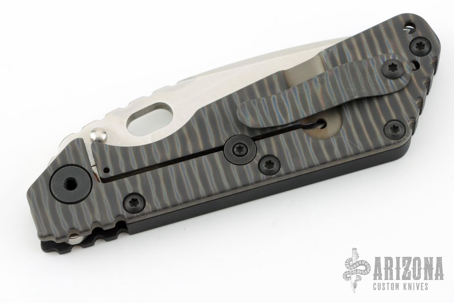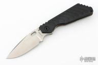 This Mick Strider SMF framelock folder features a stonewashed blade with thumbhole and notched thumbrest. The handle has a black aluminum and flamed titanium frame with titanium clip. Jimping on blade spine. Nice lockup, detent, and blade seating. Has a couple light scuffs and scratches, excellent condition otherwise.