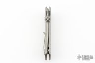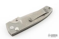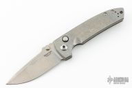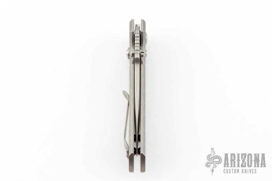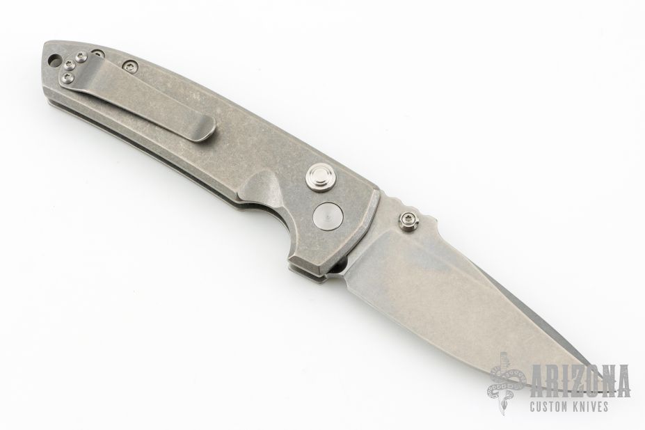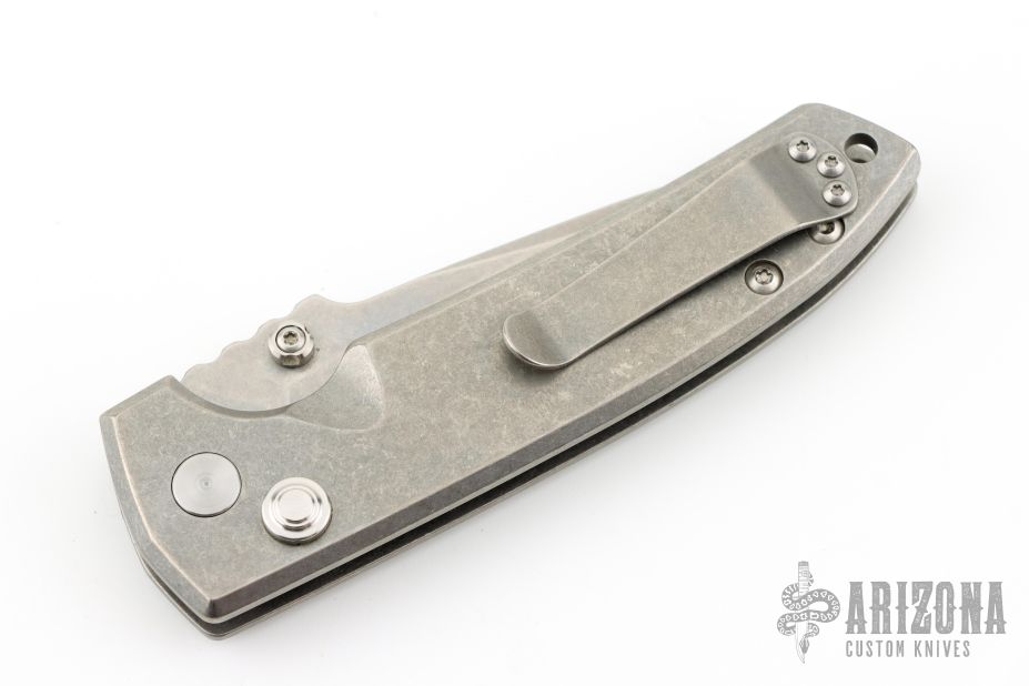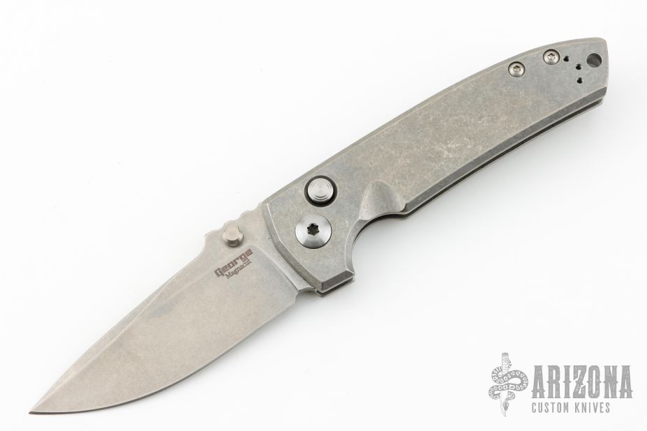 This Project VECP Buttonlock from Les George features a stonewashed CNC flat ground blade and a tumble finish titanium frame. Tip up titanium clip. Phosphorus bronze washers. Smooth action. Nice blade seating, detent and lockup. Comes with original zipper case. Excellent condition.