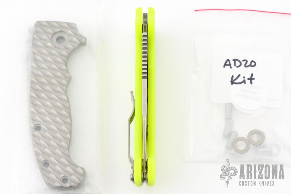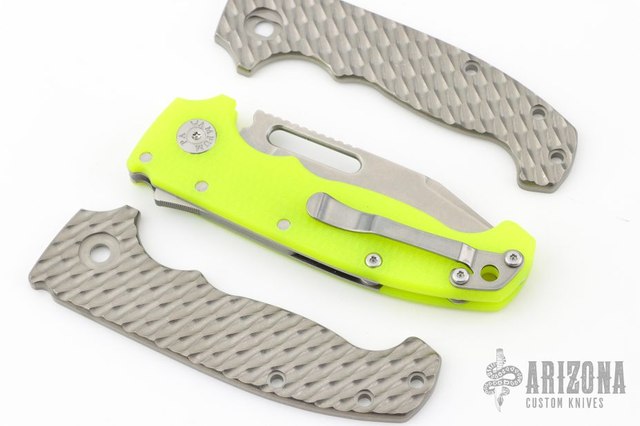 This AD20 by Demko Knives features a stonewashed clip point blade with notched thumbrest.  The handle has a G-10 frame with a tip up stainless steel clip and "Shark" lock release on the spine. Comes with original box. Listing also includes a textured titanium scale from Original Goat, as well as some titanium posts/washers. Excellent Condition.