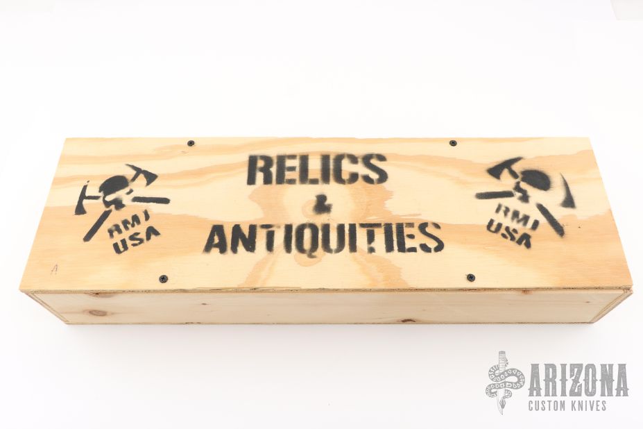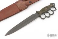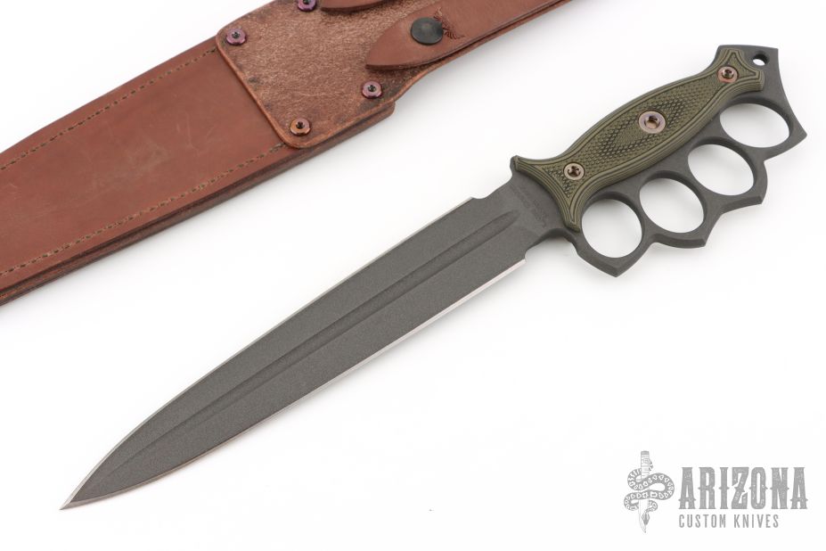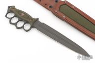 Embodying history and our own design philosophies, Lady Death is our rendition of the classic trench knife. We decided to go big, like no other, with a 15" overall length, and 9 5/8" CPM-Magnacut double-edge dagger blade with a long fuller down the middle. The knuckle duster style handle acts as a guard to protect your hands, and the aggressive outward shape works well for raking. To round out the overall shape, the end of the handle features a pronounced pomel for hammer-striking. The handle is finished with Dirty Olive G10 handle slabs with a checkered texture that is suitable in dry or wet conditions. The handle slabs are attached with Grade 5 Titanium fasteners that are electro-anodized in bronze to round out the look. Lady Death includes a brown leather sheath with a contrasting green canvas inlay. The sheath is ambidextrous, and can be worn on a belt or attached to PALS webbing.