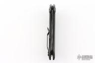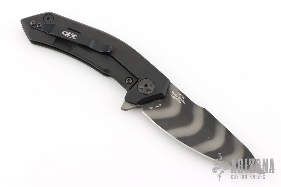 This 0095BW by Zero Tolerance knives features a tiger stripe blade with notched flipper. The handle has a black titanium frame with tip up stainless clip. Nice detent, lockup and blade seating. Comes with original box and papers. Has scuffs and scratches, and some junk in the ricasso. Good user condition.