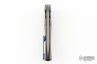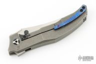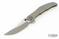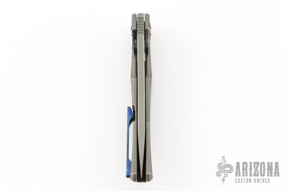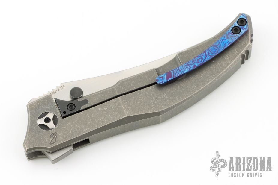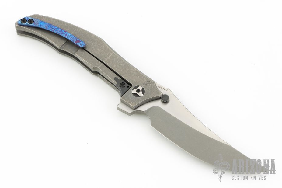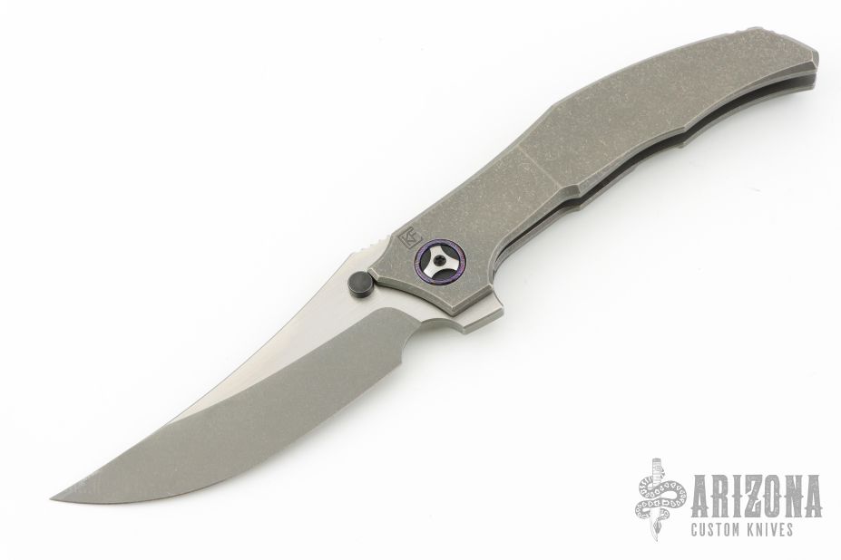 This Persian by Custom Knife Factory is a Peter Rassenti Design.  The knife has a two-tone finished blade with a notched thumbrest and flipper. The handle has a tumbled titanium frame with tip up zircuti clip, lanyard hole, stainless lock face insert with overtravel stop.  Zircuti pivot collars. Rides on bearings, nice detent, lockup and blade seating. #274 on blade. Comes with original nylon Velcro case and COA Dated 7/2023 and #274. Has a couple light scuffs, otherwise Excellent condition.