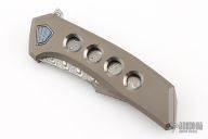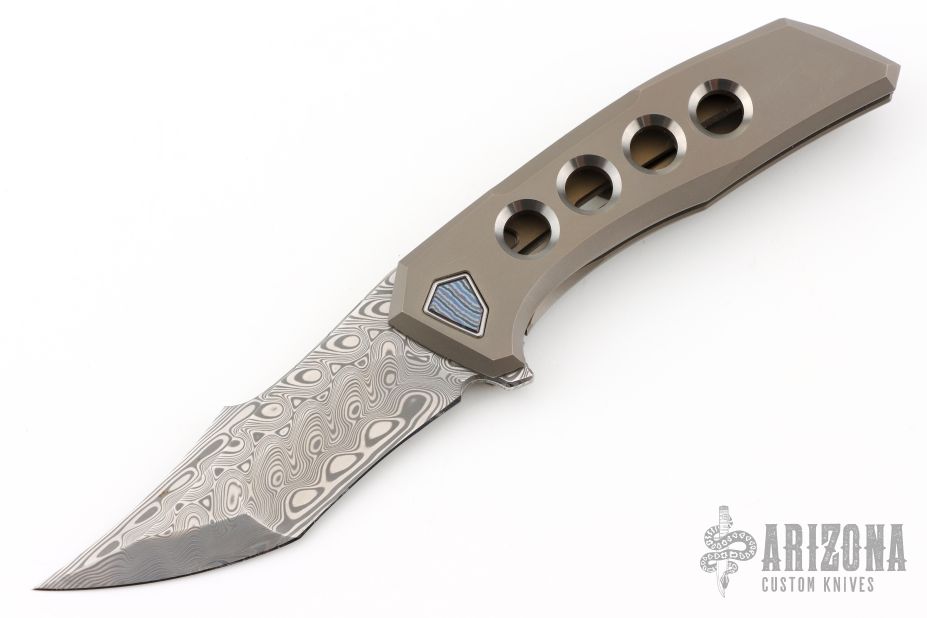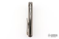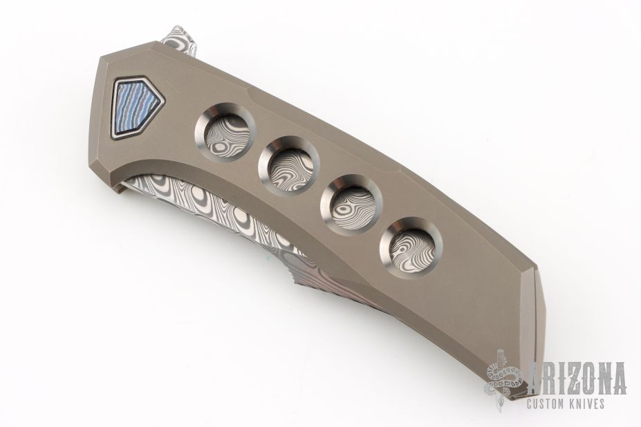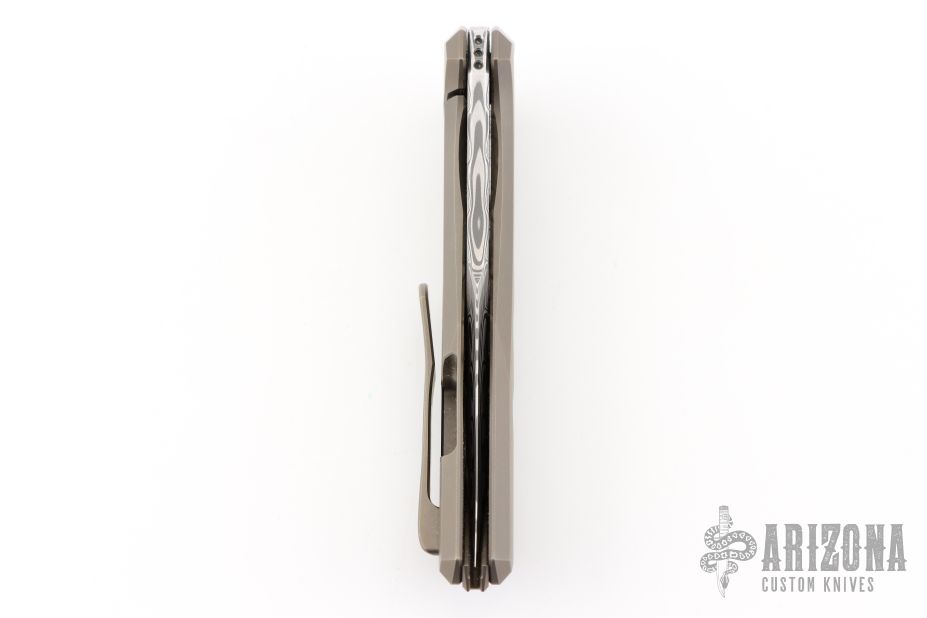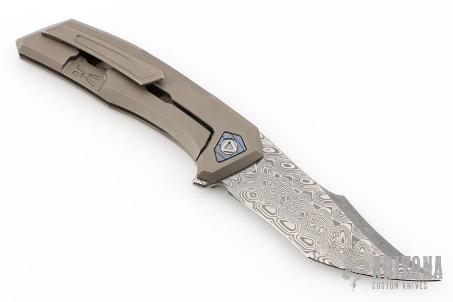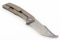 This Samurai framelock Flipper by J. Bin (Genex Blade) features a polished Damasteel blade with notched flipper. The handle has a bead blasted titanium frame with custom black timascus pivot, all hidden hardware besides the pivot, tip up titanium clip. Nice detent, lockup and blade seating. Comes in a soft pouch. Has a couple light scratches otherwise Excellent condition.