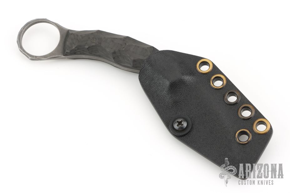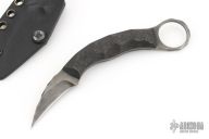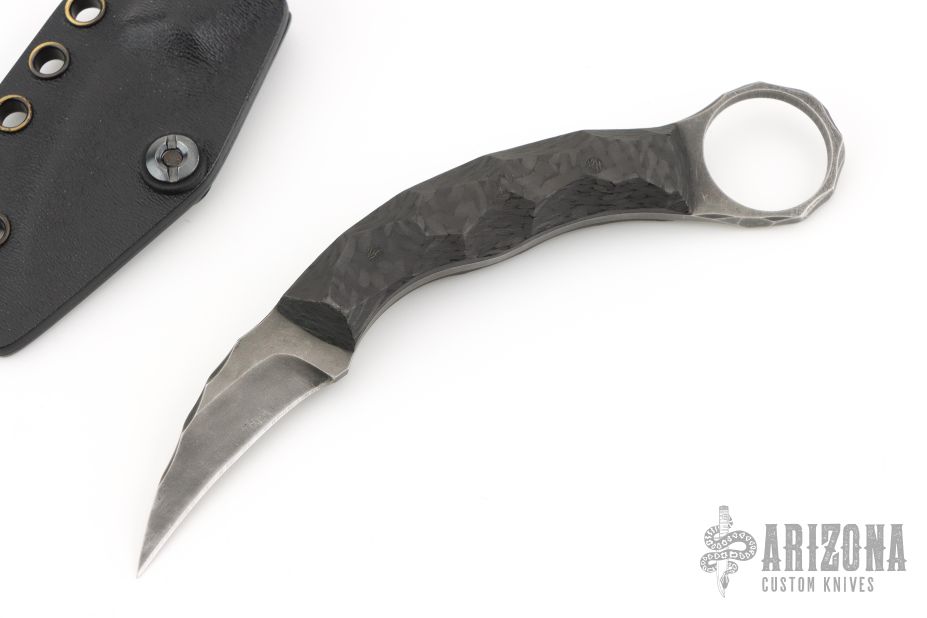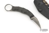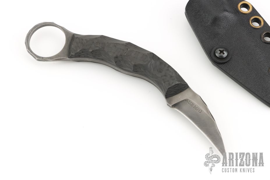 This Karambit by Auxiliary Manufacturing features an acid tumbled blade with textured spine, .136" blade stock and .7" blade depth. The handle has textured carbon fiber scales with black canvas micarta pins. Comes with a kydex sheath. Has some light scuffs and scratches, great condition otherwise.
