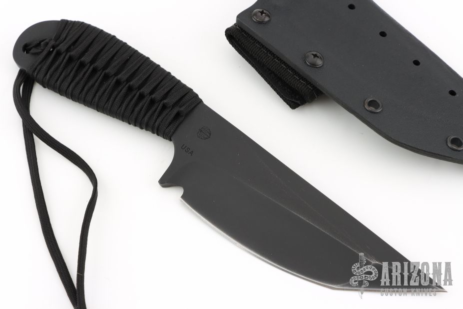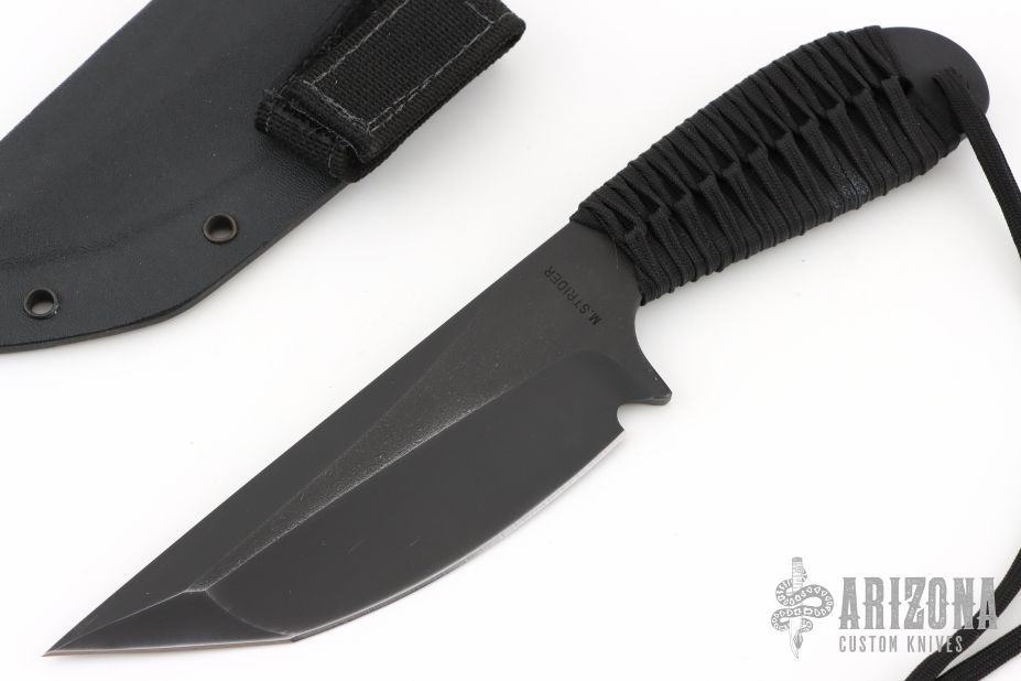 The XL Dub Tanto by Mick Strider features a black blade with false top edge, .215" Blade Stock and 1.848" Blade Depth, full tang construction with black paracord. Comes with kydex sheath. Has some light scuffs and scratches, great condition otherwise.