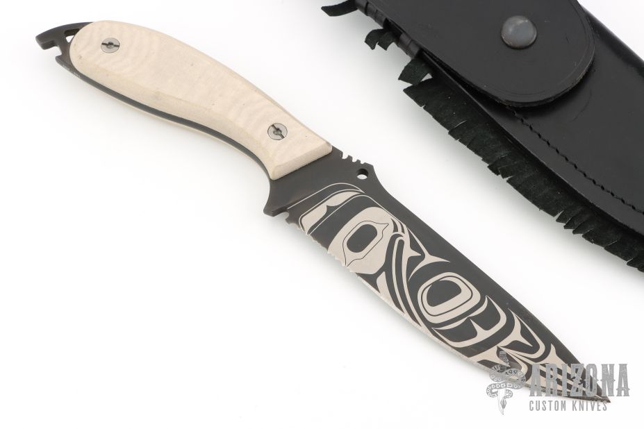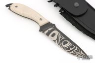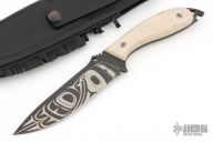 The DPx Raven is a limited edition fixed blade knife that was inspired by the dark wilderness of the Pacific Northwest. It is both a work of art and competent field knife. The six inch Sleipner tool steel blade is decorated with a traditional Tlingit-inspired representation of a raven's crest designed by Robert Young Pelton and based on his book Raven. The blade is TiCN PVD coated in a black finish treated with a laser to burn off the carbon, giving the knife a two-tone finish while maintaining surface hardness. Two inches of aggressive serrations at the base of the blade flow through bone or branch. The bone-colored Micarta scales conceal a cavity for fishhooks, fire starter, or other survival materials.