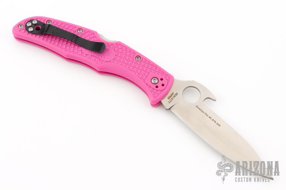 This Spyderco Endura knife has a flat saber-ground VG-10 stainless steel blade with the Emerson Wave opening feature. The handle is blue/gray FRN.