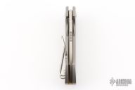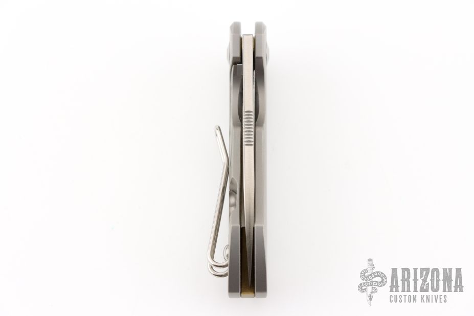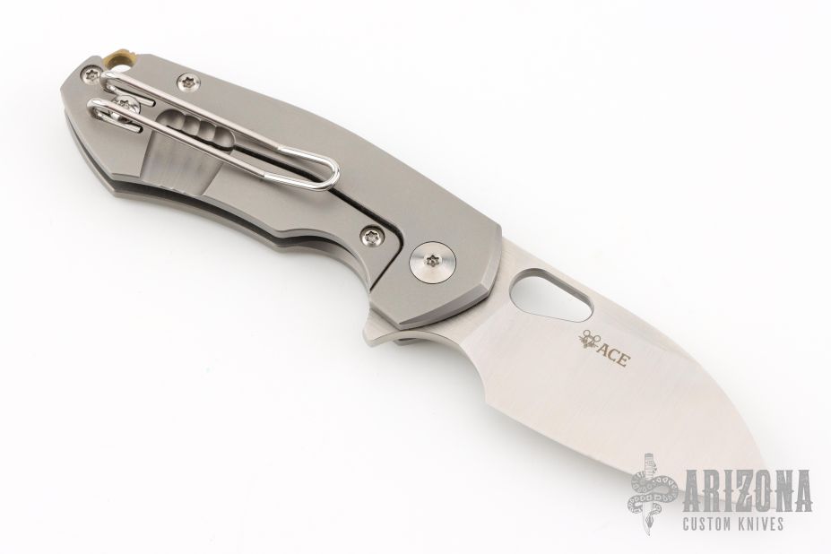 The ACE Riv by Giant Mouse Knives features a satin blade with flipper. The handle has bead blast finish titanium frame with tip up clip. Anodized notched backspacer.  Comes with original box and card. Has a couple light scuffs and scratches, otherwise excellent condition.