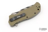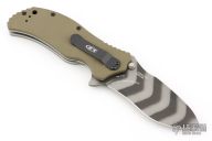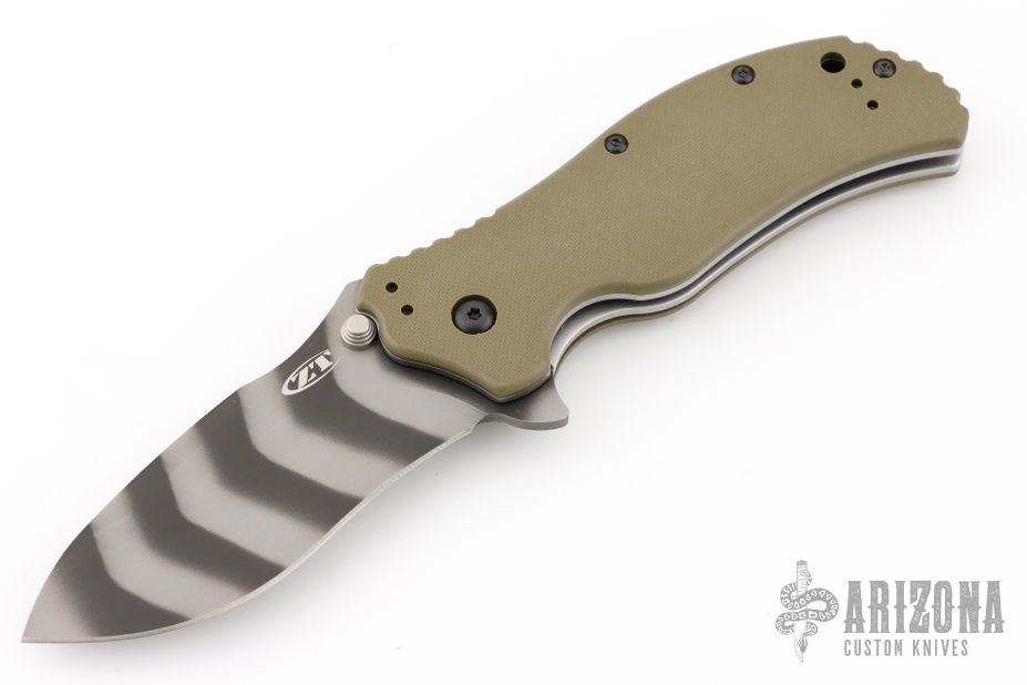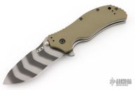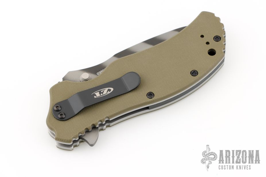 This 0350TS liner lock flipper is a Ken Onion design executed by Zero Tolerance and features a recurved spear-point blade with a tiger stripe finish, stainless steel liners and green G10 scales. It also features the Speed-safe assisted opening system. The black coated steel clip is 4 way adjustable. Perfect function. Includes original box. Excellent Condition.  #0138