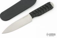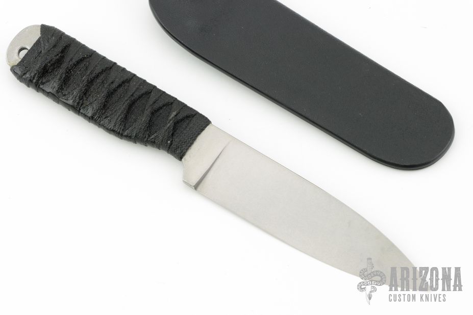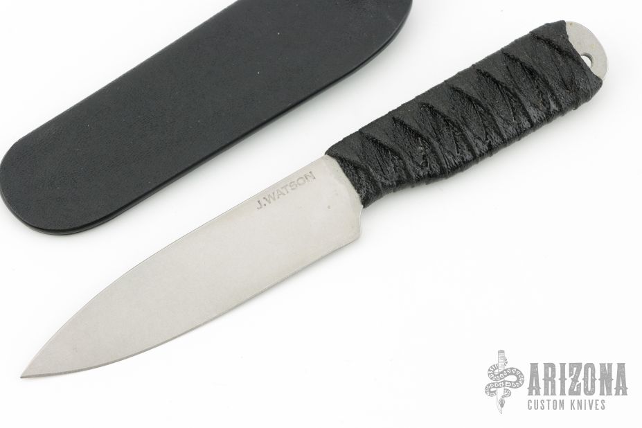 This fixed blade from Joe Watson features a satin finished, chisel ground drop point blade. .109" bladestock, and 1.058" blade depth. The handle is comprised of Japanese style wrap over hidden tang construction. Includes kydex sheath. Has a couple light scuffs, excellent condition otherwise. Excellent condition.