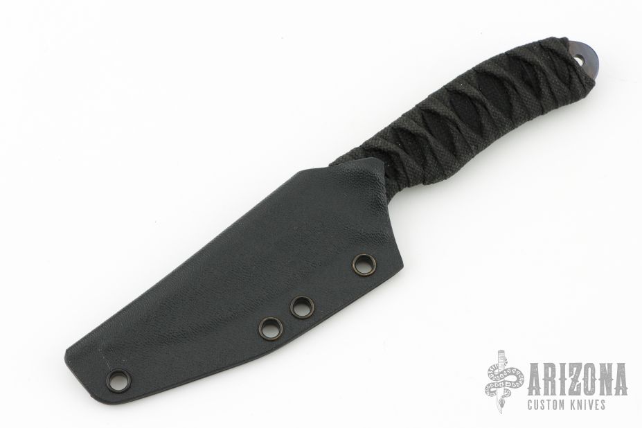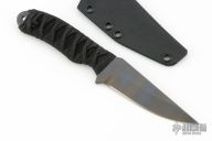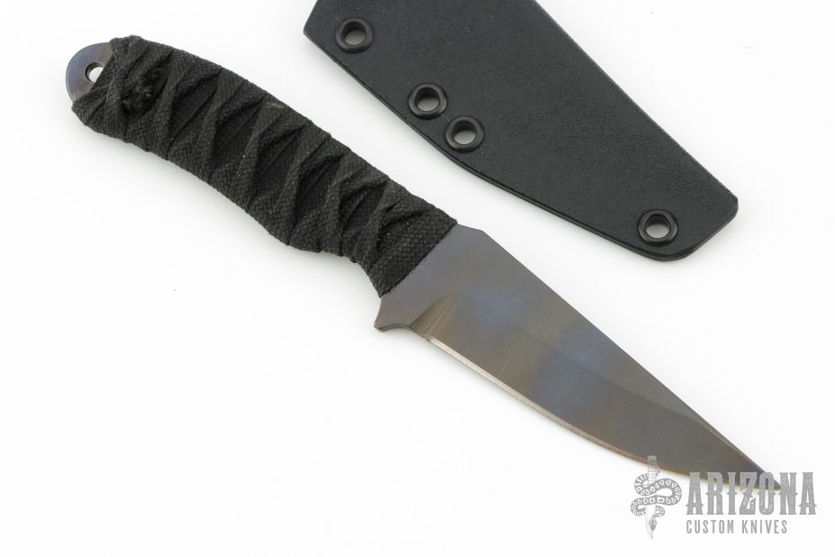 This Sidon by Joe Watson features an anodized titanium blade with a carbonized edge, .122" blade stock and 1.130" blade depth. The handle has flat black cord wrap. Comes with a kydex sheath. Has a couple light scratches, Excellent condition.