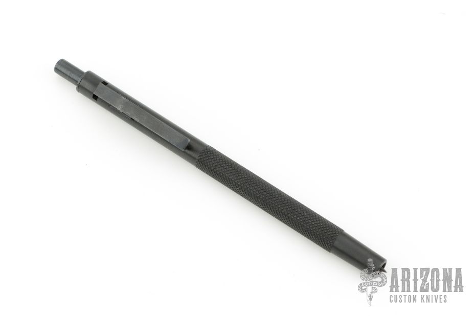 Automatic spike extends quickly when pocket clip is pressed. Recharge spike by pressing it back into pen with hard surface. Has some minor wear on the finish, otherwise excellent condition.