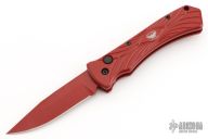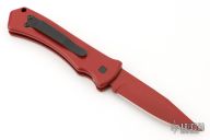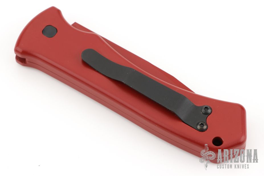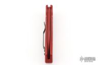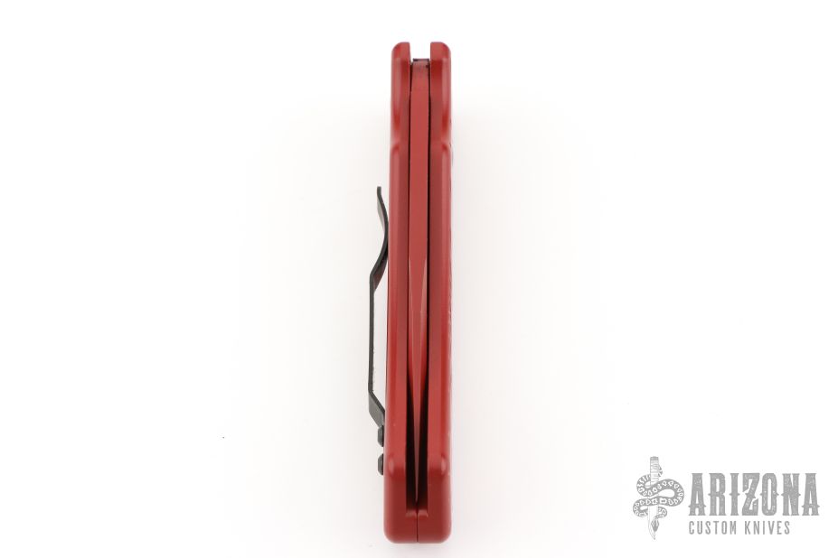 This knife features a red PVD-coated blade paired with a durable aluminum frame. It comes equipped with a black steel tip-up pocket clip and a smooth push-button mechanism. The knife is in excellent condition and includes the original box.