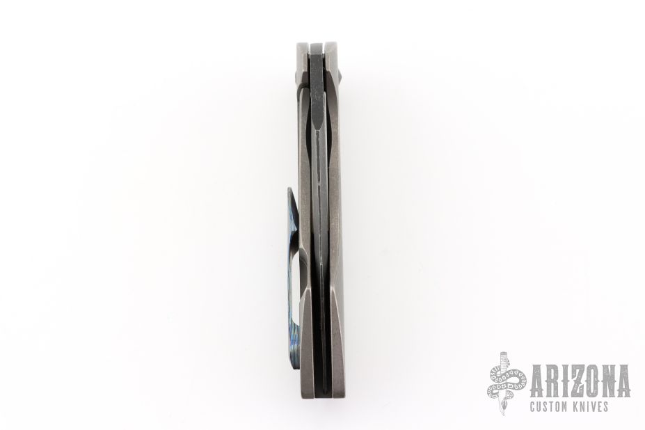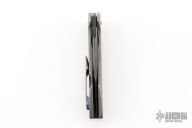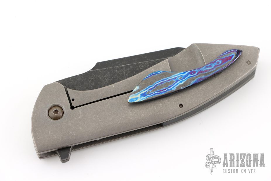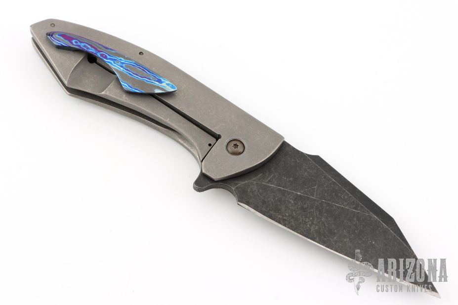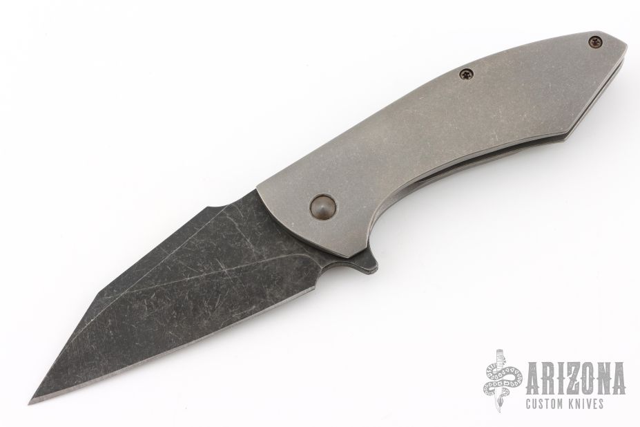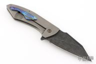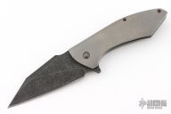 This Hellcat flipper by Fernando Medina features an acid/tumble finished blade with swedge and flipper. The handle has a tumbled titanium frame with a Zircuti tip up clip and a carbon fiber backspacer. Rides on bearings. Nice detent and lockup. Comes in a zipper case. Has some light scuffs and scratches, great condition otherwise.