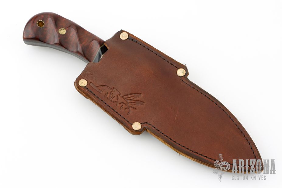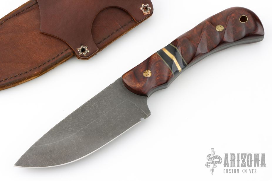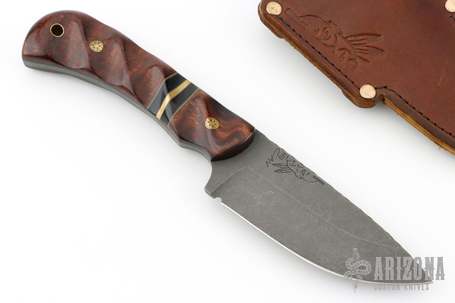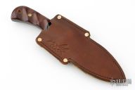 This Cavner by Half Face Blades features an acid tumble finished blade with fileworked spine, .146" blade stock, 1.533" blade depth, full tang construction. The handle has wood covers, mosaic pins, lanyard hole, and micarta/brass spacers. Comes with original box, brown leather sheath and papers. Excellent condition.