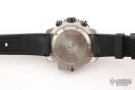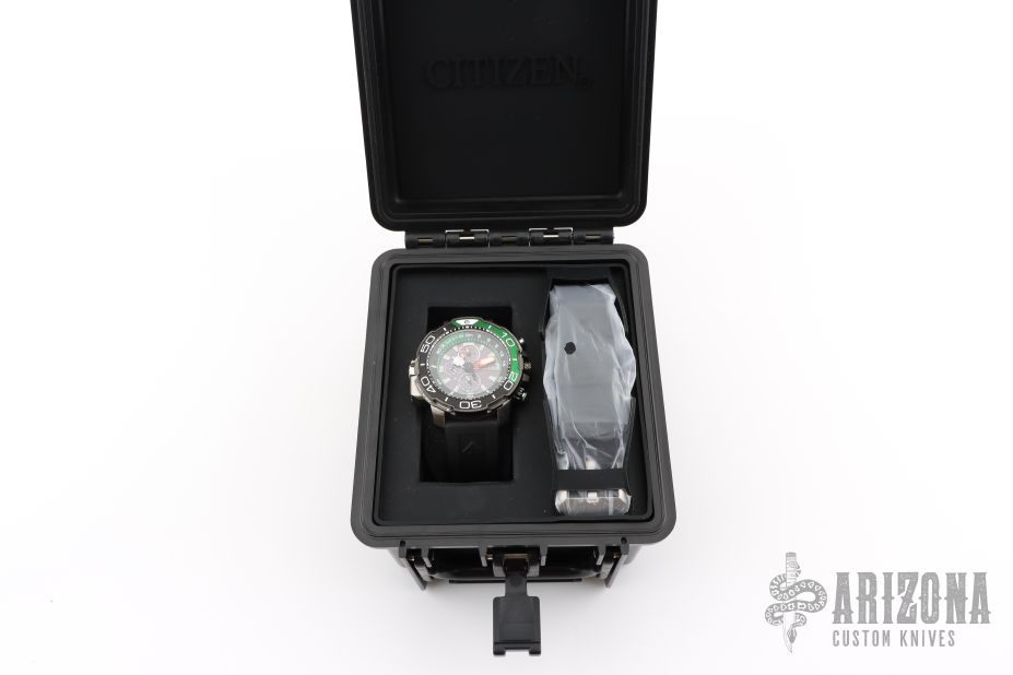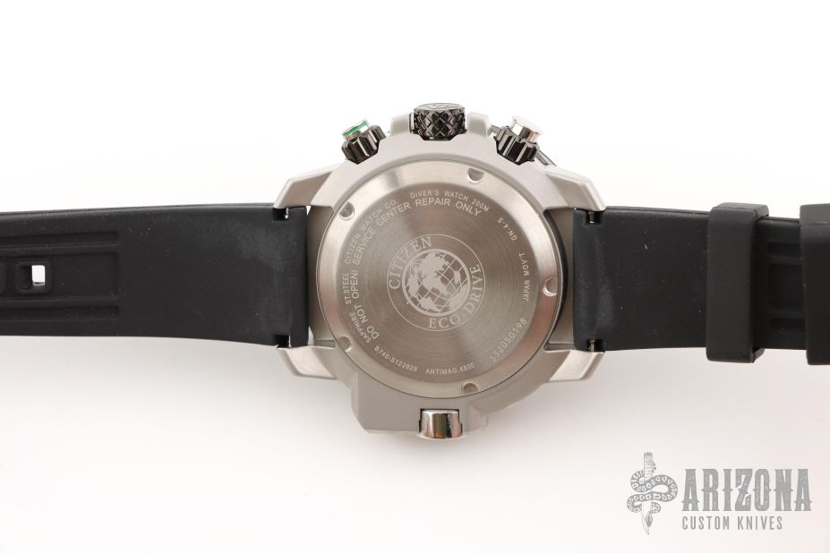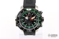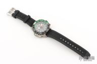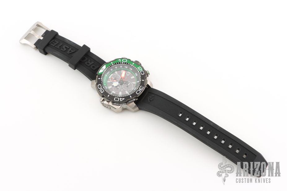 With a black polyurethane strap and stainless steel case with DLC, the Promaster Aqualand from CITIZEN stands out from the crowd. This dive watch — which is water resistant up to 200 meters — has a black face with green accents, and uses Eco-Drive technology, so it is powered by light — any light. Other advanced features include maximum depth memory, a power reserve indicator, the date, 12/24-hour time formats and chronograph.