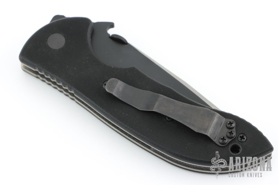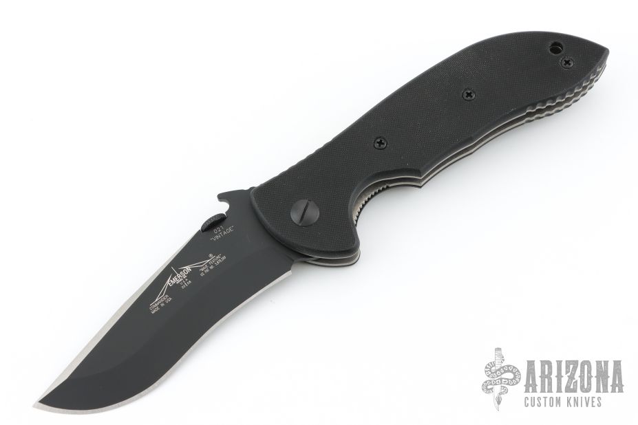 This limited edition vintage Commander linerlock folder has a two-tone satin and black recurve blade and black G10 handle. Thumb disc and wave feature. S/N 021 of only 25 that Ernie Emerson built to duplicate the famed heavy '98 Commander. Includes original box and paperwork. Excellent condition. 2008