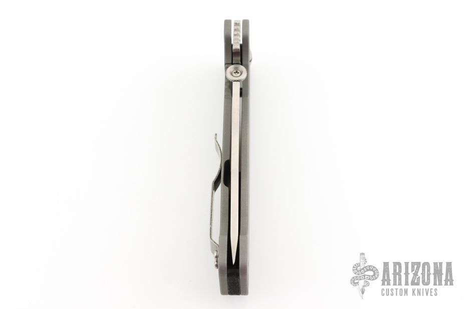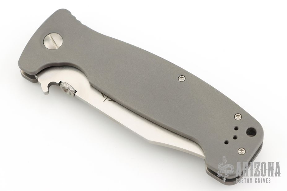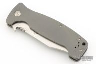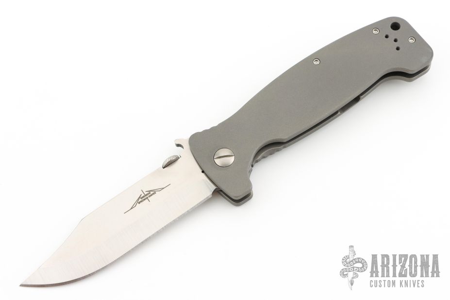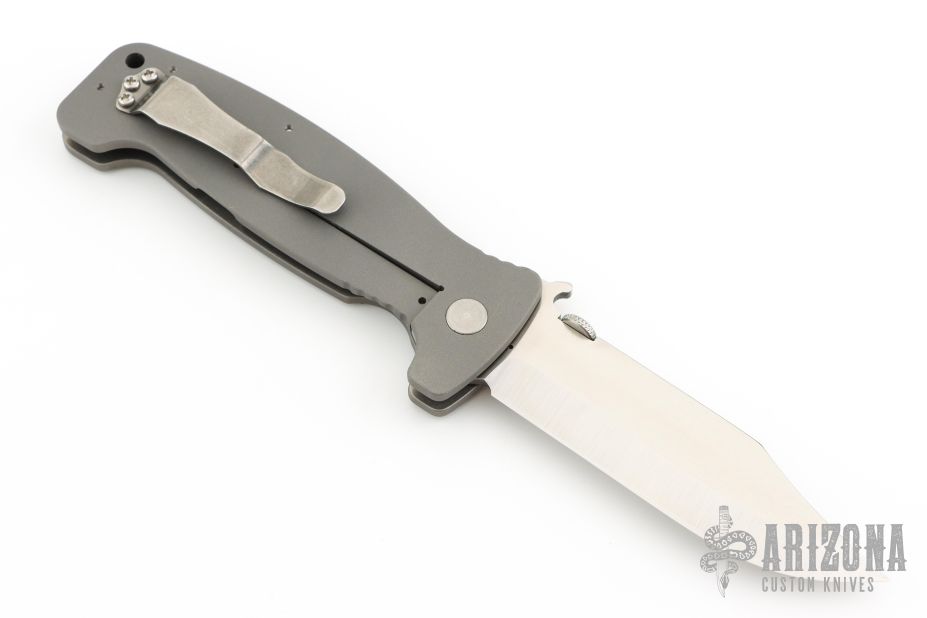 This is the CQC-12 Comrade, this design was based on Ernie's study of the AK-47 Bayonet. This is the same Model that Ernie himself carries. A true classic and a very rare opportunity for the serious Emerson collector. This one has a sterilesatin finished blade with thumbdisc and wave feature. The handle has bead blast finished titanium frame with a black tip up stainless steel clip. Nice lockup, detent and blade seating. Comes with original box and papers. Has a very light scuffs, otherwise excellent condition.