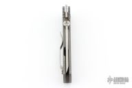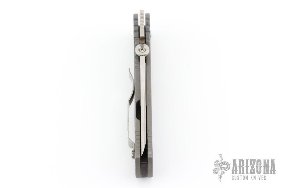 This Custom HD-7 features a satin finished chisel ground tanto blade with a knurled thumb disc and wave.  The handle features a bead blasted titanium frame with a tumbled stainless tip up pocket clip.  Black G-10 Backspacer.  Includes the original box and papers.  Nice detent, lock up and blade seating. The pivot is tightened enough to effect the action - not easily opened/closed. Has a couple light scuffs. Excellent Condition.