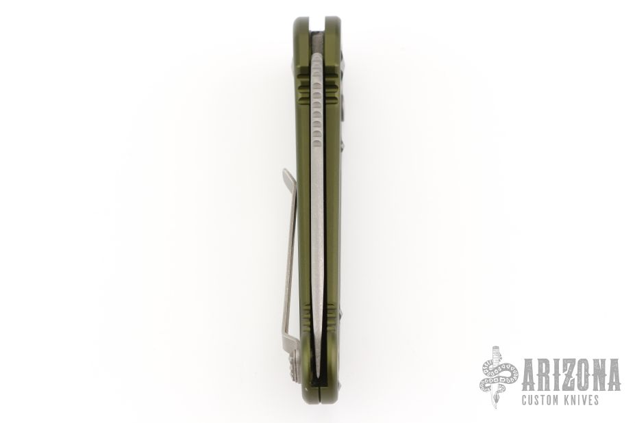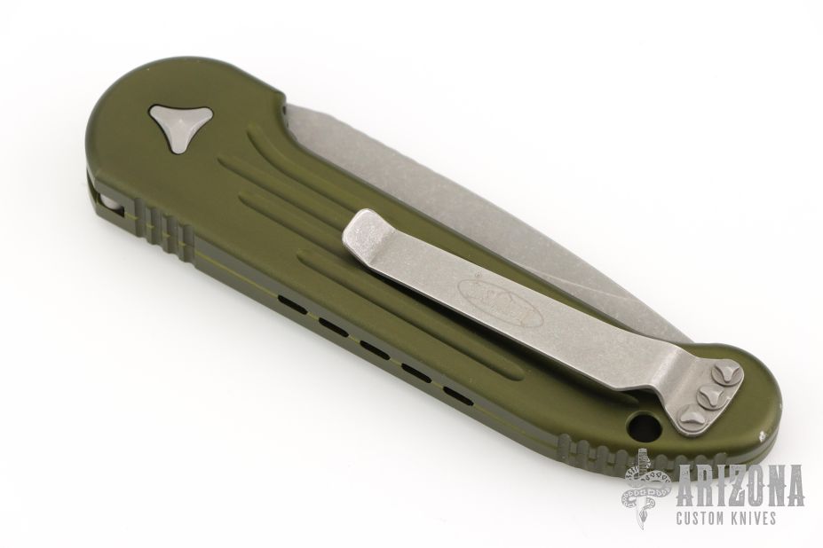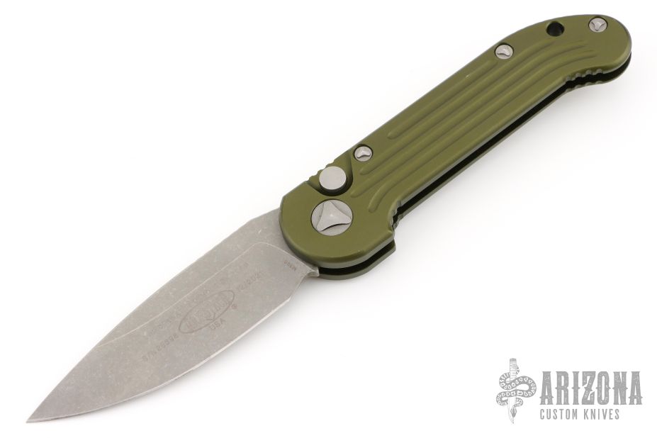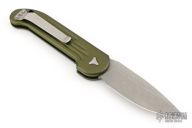 This LUDT side opening automatic by Microtech has an Apocalyptic finished blade with a standard edge and a contoured OD green aluminum frame. Stainless steel clip. Dated 12/2021 and serial number 25398. Comes with original box and papers. Excellent Condition.