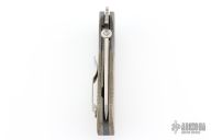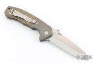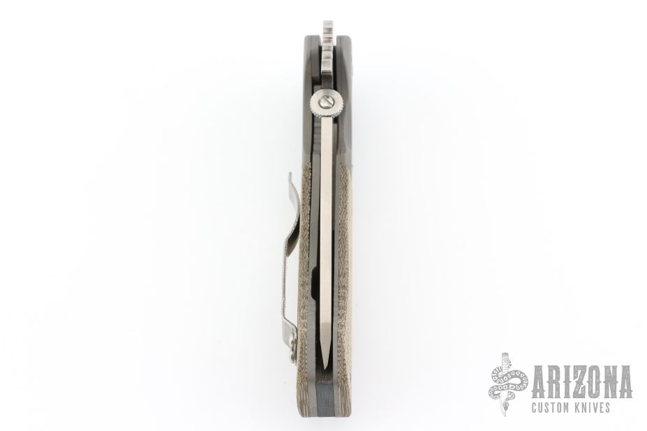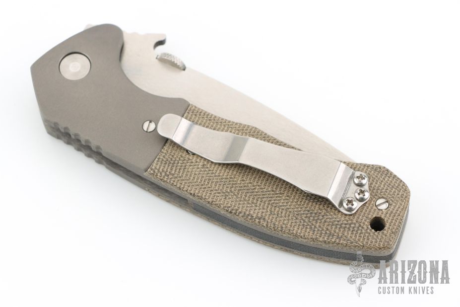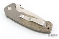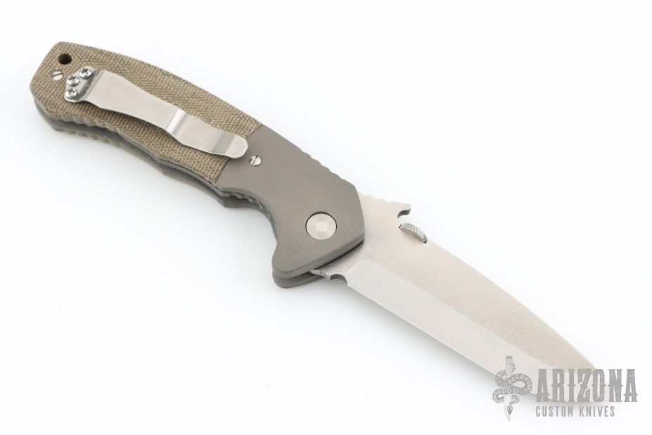 This Custom CQC-14 from Emerson features a hand-ground satin finish blade with a chisel grind, bead blasted and dovetailed titanium bolsters and liners, and green micarta scales, black G-10 backspacer. Stainless steel clip. Thumbdisc and Wave feature.  This is the custom "Long Blade" version which is not available as a production knife. Includes original box and papers. Marked prototype. Excellent condition.