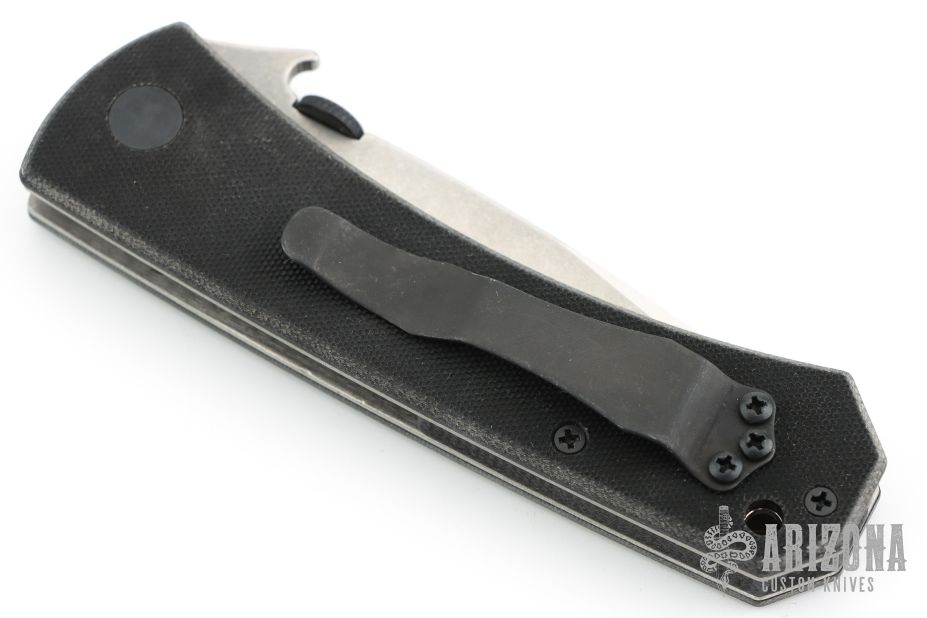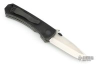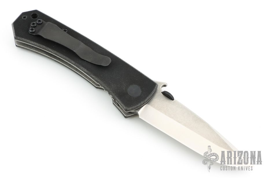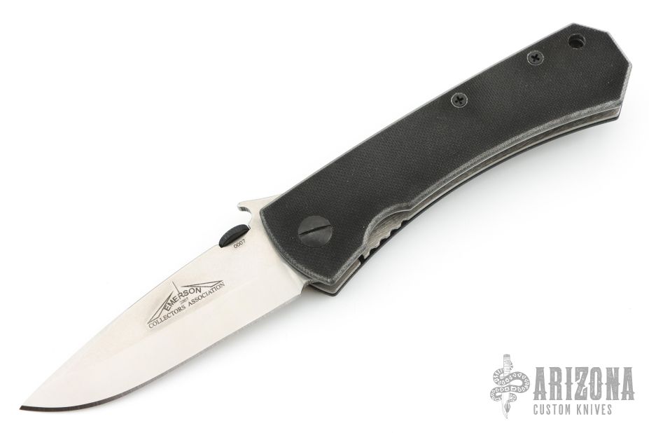 This A131 by Emerson Knives has a stonewashed blade with thumbdisc and wave feature. The handle has textured black G-10 scales, titanium liners, and a tip up stainless steel clip. Emerson Collectors Association Knife of the Year 2007 s/n 0007. Comes with original box and papers. Has some scratches on the clip, otherwise Excellent condition.