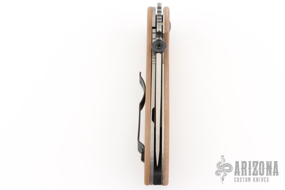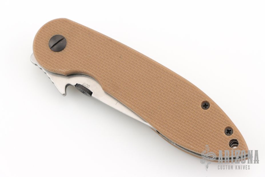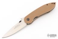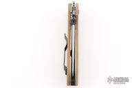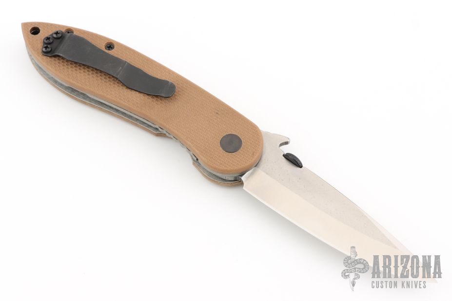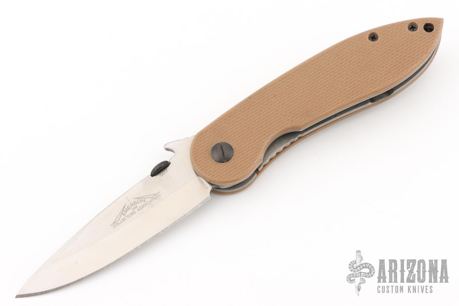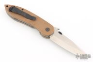 This A136 by Emerson Knives has a stonewashed blade with thumbdisc and wave feature. The handle has textured brown G-10 scales, titanium liners, and a black tip up stainless steel clip. Emerson Collectors Association Knife of the Year 2008 s/n 0017. Comes with original box and papers. Has some scratches on the clip, otherwise Excellent condition.