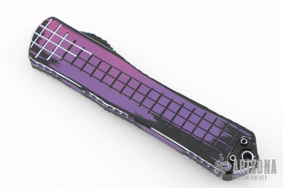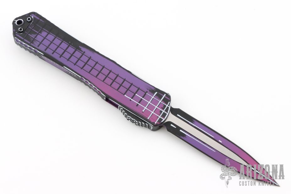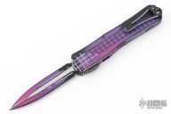 This Manticore-X by Heretic Knives features a purple/black finished double-edged blade. The handle has a purple/black aluminum frame with black stainless steel hardware and tip down clip. Comes with original box and papers. #087 05/2025. Excellent condition.