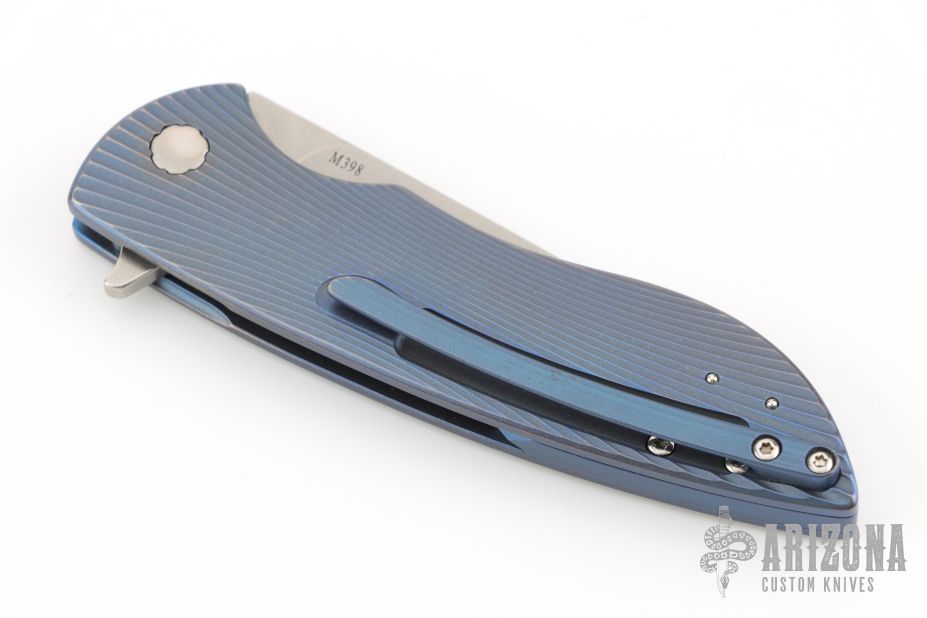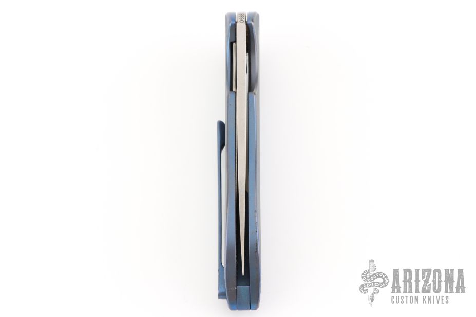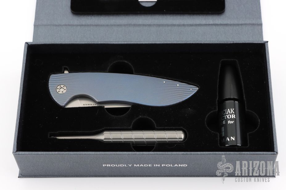 This Sting Flipper by Herman Knives features a stonewashed drop point blade and flipper. The handle has a milled and anodized titanium frame, liner, tip up clip and backspacer. Nice detent, lockup and blade seating. Rides on bearings. Comes with original box, tool, lube, and metal COA 02.01.2025. Excellent condition.