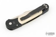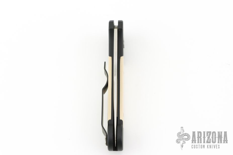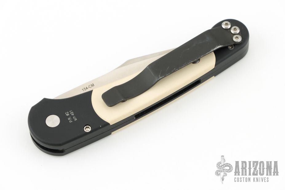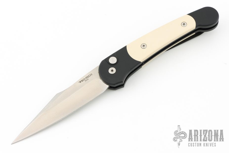 This Monaco by Pro-Tech is a nice sleek automatic with a satin finished clip point blade. The handle is black aluminum with an ivory micarta scales. Second production run, serial number #491. Has a couple light scuffs and scratches, excellent condition otherwise.