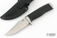 Here's an early production find for a Benchmade. This model 10500 Rant Bowies (superseded by the 10501 and 10502) is early production made of 440C steel. 1/8" blade stock and 1 5/16" blade depth, hidden tang construction. Mel Pardue design. Sure grip rubber textured handle and stainless guard and butt. Great day hiker or even a large EDC. Comes with original black leather sheath. Excellent condition.