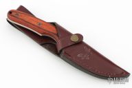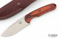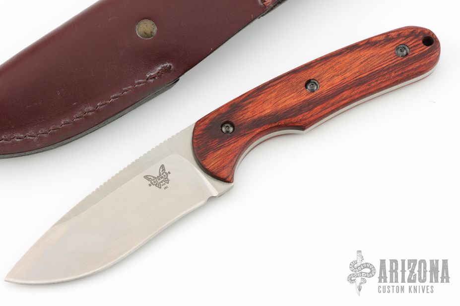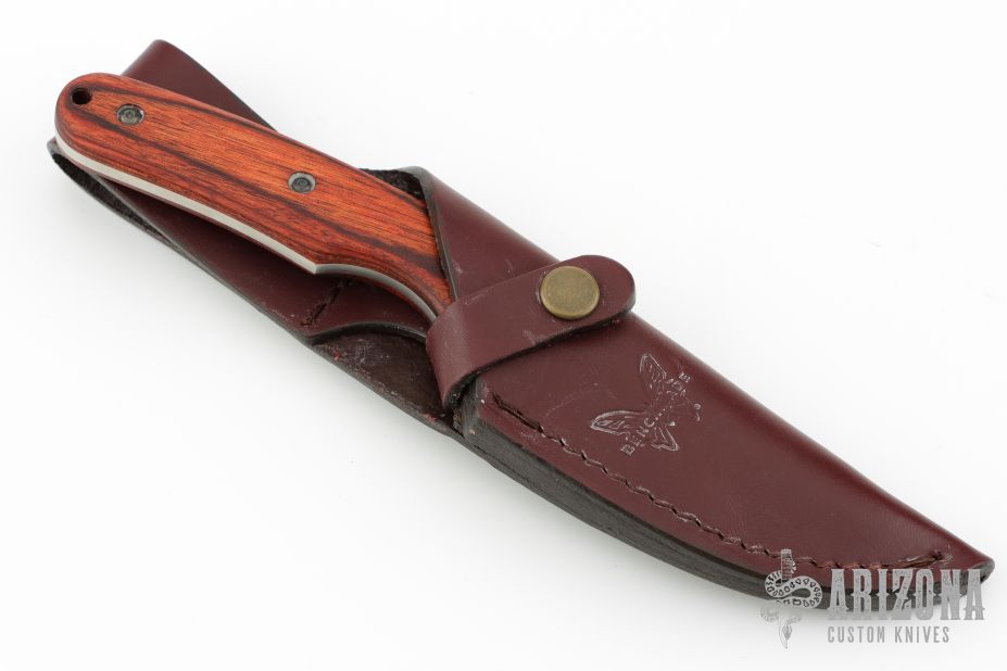 This Large Activator by Benchmade is a Snody design. It features a .136" thick tumble finish blade with .609" blade depth, full tang construction. Notched thumbrest. Wine Wood scales. Comes with brown leather sheath.  Has a couple light scratches, excellent condition otherwise.