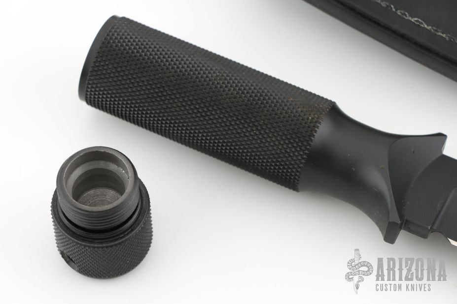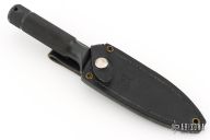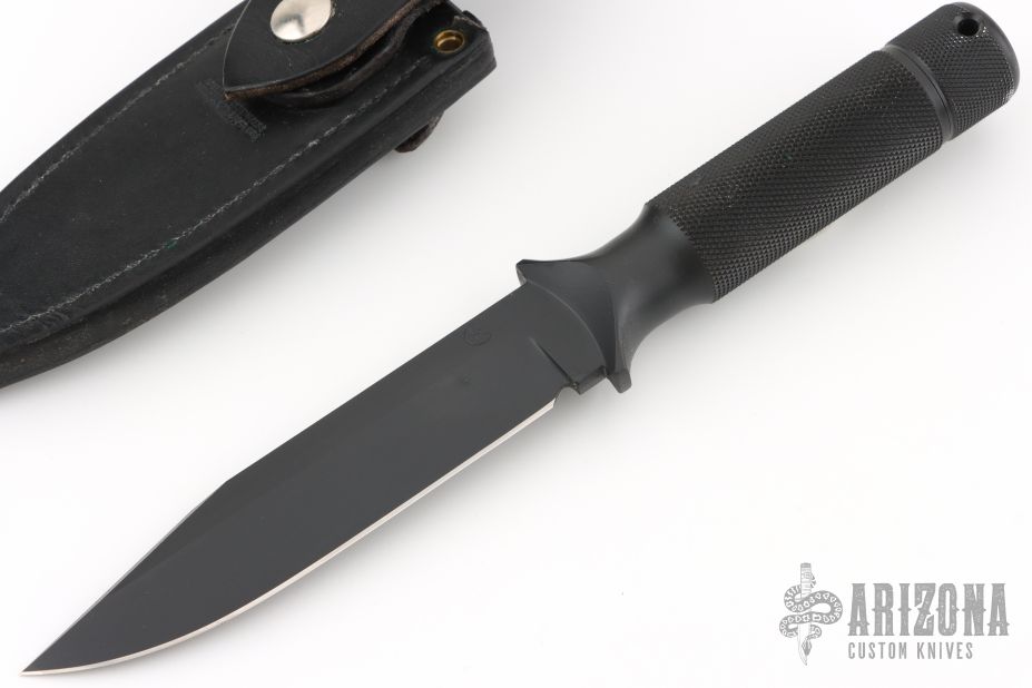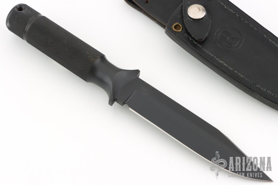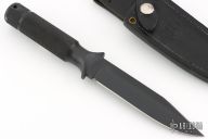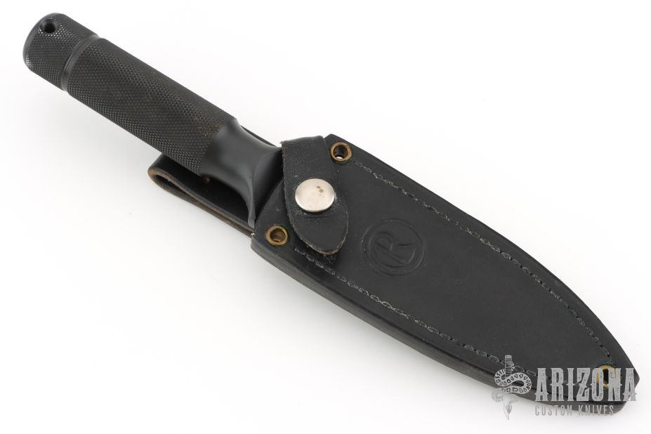 "Designed to incorporate the two basic criteria required in knives destined for hard field usage, these spear-points have plenty of blade weight and good strong points. This design has been used by soldiers all over the world who have found them to be extremely good weapons as well as rugged dependable tools. The 5.5” bladed Shadow IV is a good everyday carry knife and the pancake sheath rides high and snug." This one has a spear point blade with false top edge, .197" blade stock and 1.175" blade depth. Comes with original black leather sheath. Has some light scuffs, excellent condition.