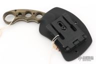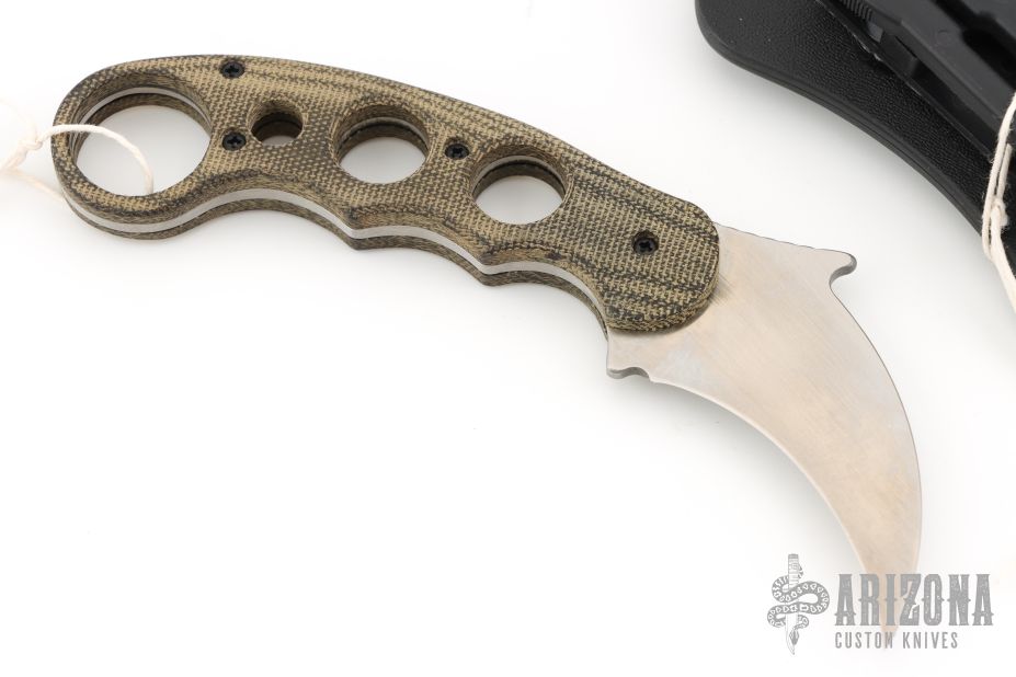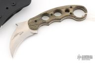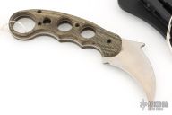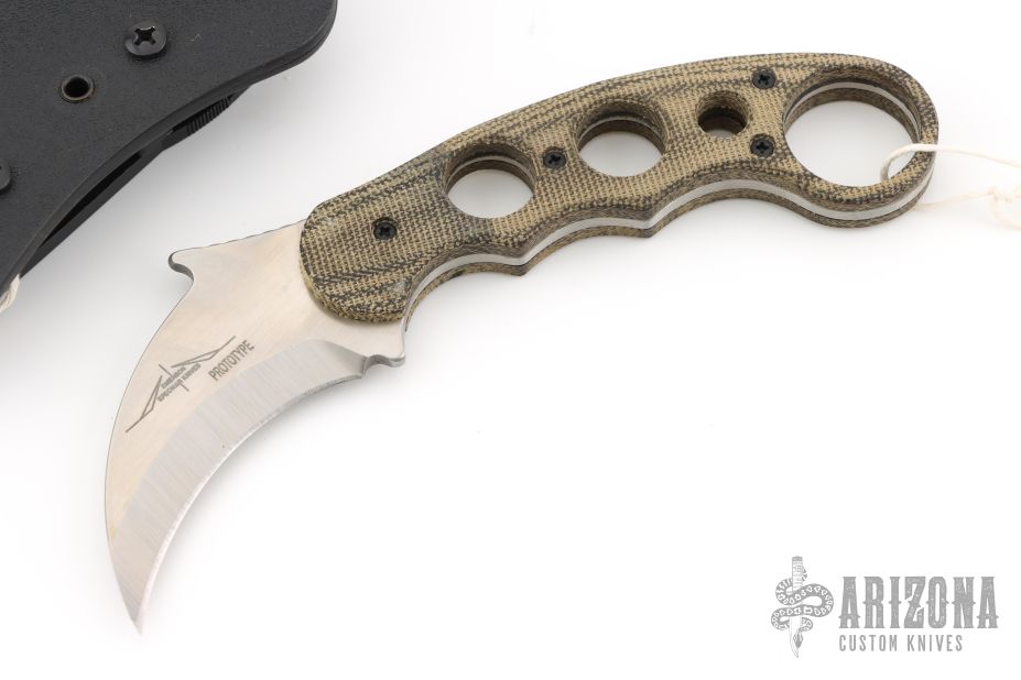 This karambit by Emerson Knives features a satin finished chisel ground hawkbill blade with a full tang construction.  .125" Blade Stock.  1.299" Blade Depth. The handle has green micarta scales.  Includes a kydex sheath with clip. Marked "Prototype" on the blade. Excellent Condition.