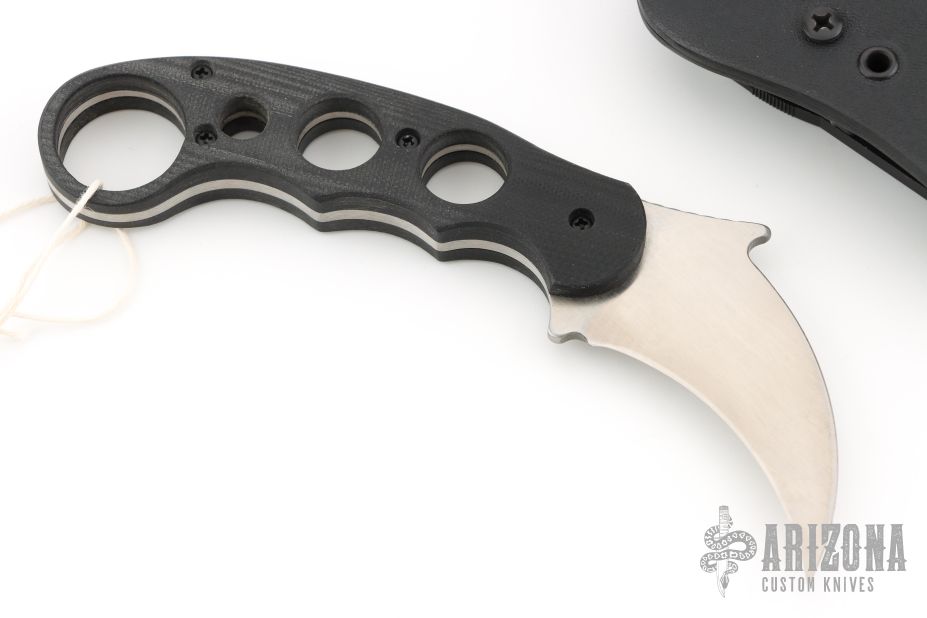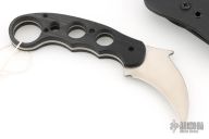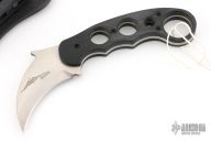 This karambit by Emerson Knives features a satin finished chisel ground hawkbill blade with a full tang construction.  .125" Blade Stock.  1.299" Blade Depth. The handle has black G10 scales.  Includes a kydex sheath with clip. Marked "Prototype" on the blade. Excellent Condition.