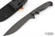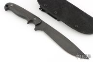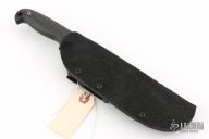 This subhilt fighter by Trace Rinaldi was designed in collaboration with Rob Paton. It features a black Damascus blade, .143" blade thickness and 1.266" blade depth. Notched thumbrest. Full tang construction. Comes with a leather sheath with Kydex liner and clip. The handle has carbon fiber scales with lanyard hole. The contours give the knife a great feel in the hand. Excellent condition.