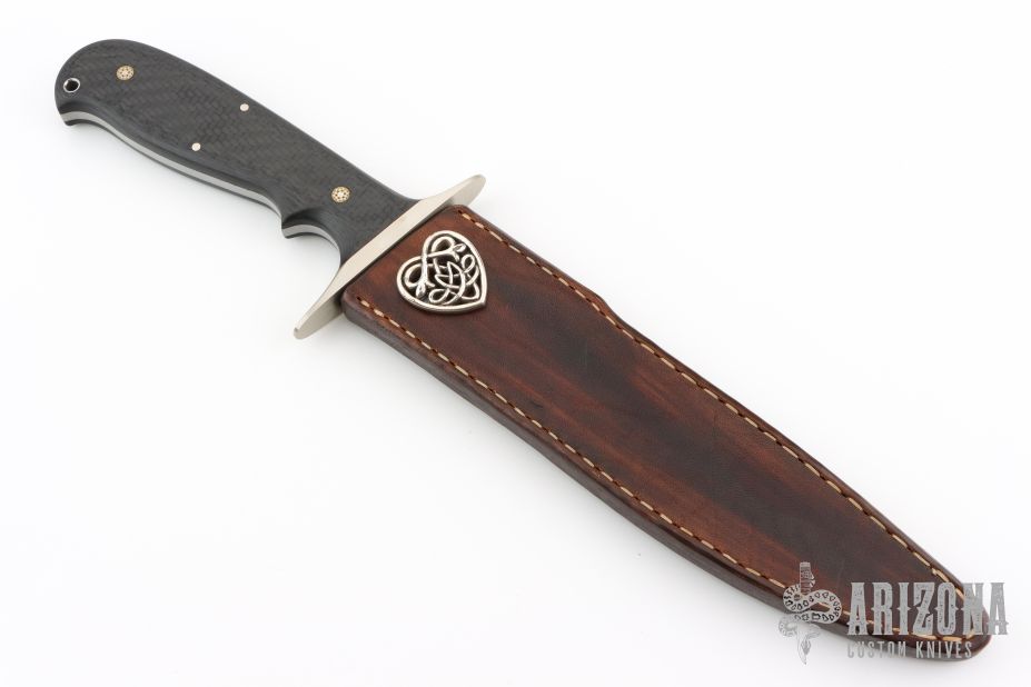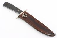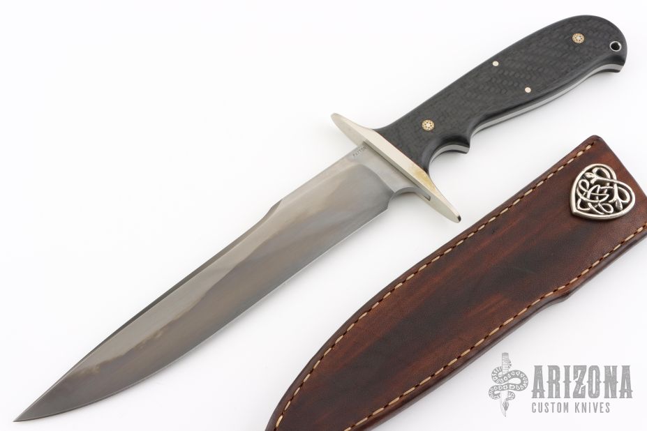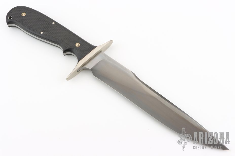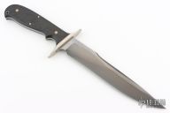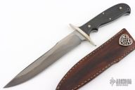 This Fighter by Journeyman Smith Rob Patton features a hand rub satin finished blade with a hamon and false top edge, .220" blade stock and 1.478" blade depth, full tang construction. The handle has a nickel silver guard and carbon fiber scales. Comes with a brown leather sheath and a zippered case. Has some scratches and patina, otherwise excellent condition.