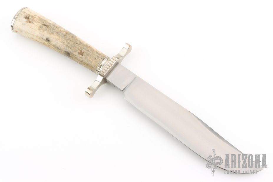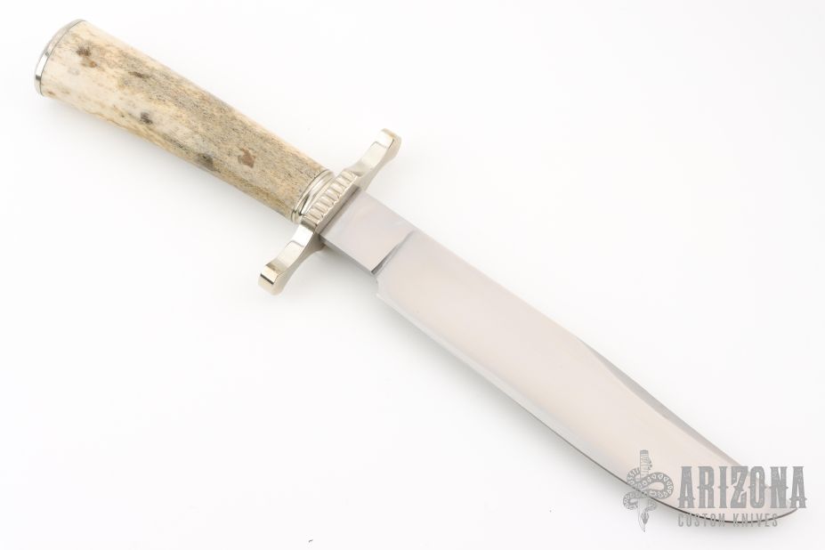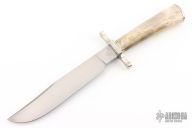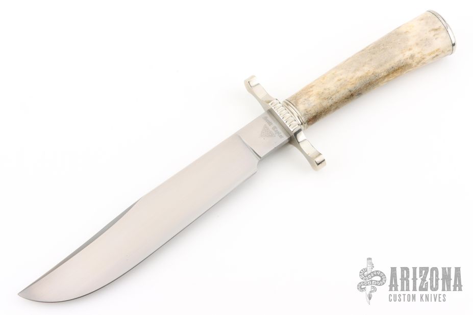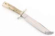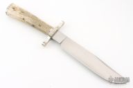 This bowie by Mastersmith Scott Taylor features a hand rub satin finished blade with false top edge, .228" blade stock and 1.226" blade depth, hidden tang construction. The handle has a nickel silver guard/ nickel silver fluted collar, nickel silver pommel, and bone grip. Comes with a zipper case. Excellent condition.