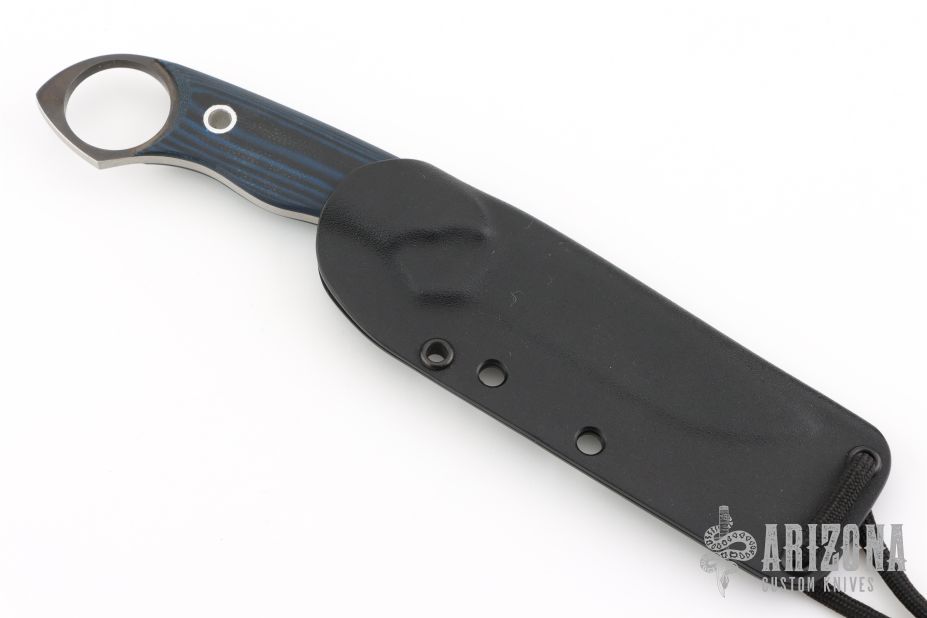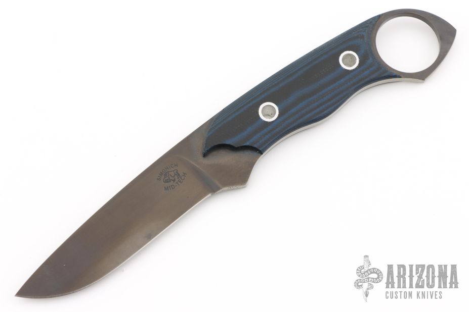 The Crowfoot Mid-Tech by Rob Simonich is a cross between a Karambit-type handle mated with a drop point utility blade, .126" blade stock and .814" blade depth, full tang construction. The handle has black/blue G-10 scales and a finger hole at the butt. Perfect for deep concealment or open carry. Comes with kydex neck sheath and maker's card. Light scratches are visible on the blade otherwise the knife is in excellent condition.