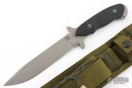 This Combat Raven by Rob Simonich features a grey coated blade with false top edge, .192" blade stock and 1.306" blade depth, full tang construction. The handle has gunner grip black G-10 scales, extended tang with lanyard hole. Comes with nylon sheath and maker's card. Has some scuffs, otherwise excellent condition.