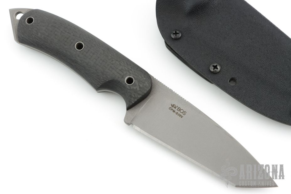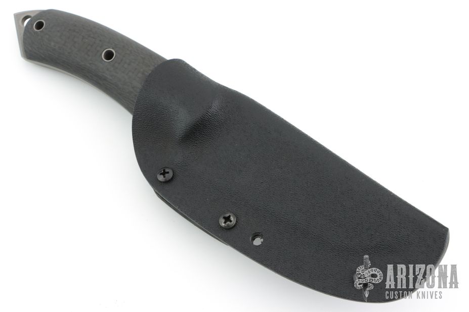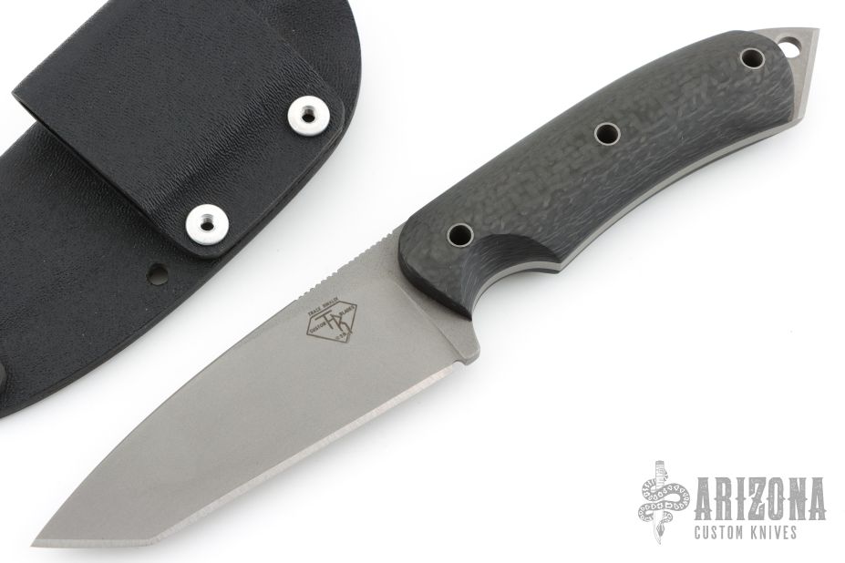 This knife by Trace Rinaldi features a bead blast finished drop point blade with notched thumbrest, .154" blade stock and 1.508" blade depth, full tang construction. The handle has textured carbon fiber scales. Comes with a kydex sheath with belt clip. Has a couple light scratches and scuffs, otherwise excellent condition.