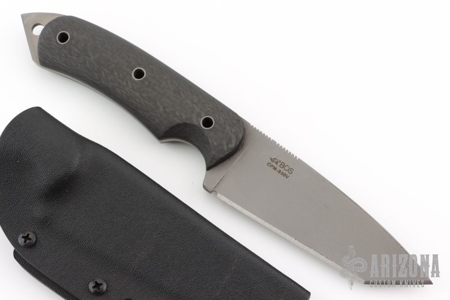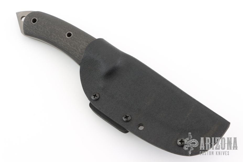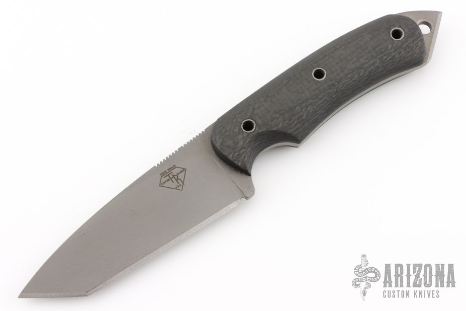 This knife by Trace Rinaldi features a bead blast finished drop point blade with notched thumbrest, .154" blade stock and 1.480" blade depth, full tang construction. The handle has textured carbon fiber scales. Comes with a kydex sheath with belt clip. Has a couple light scratches and scuffs, otherwise excellent condition.