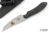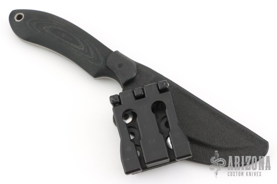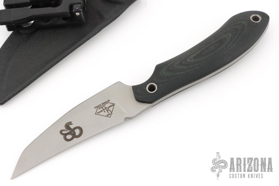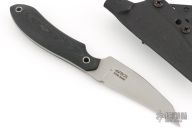 This Disciple by Trace Rinaldi has a bead blast blade with a sharpened top edge and black G10 handle, full tang construction, blade thickness of .123" and depth of 1.066".  The bottom edge of the blade is not sharpened. Comes with a kydex sheath with clip. Has some light sheath marks, and a single rust spot on the blade, b-side near the blade steel mark. Great condition otherwise.