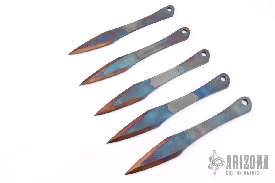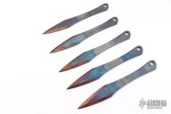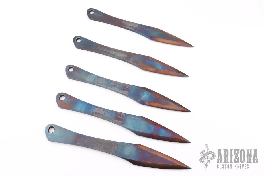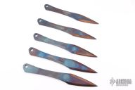 This Throwing Knife Set of Five from Cresent Knife Works (spelled this way in the logo, stamped on the belly of the knife) features full tang construction, .262" blade stock, 1.65" blade depth. The blade is beveled to 6". These knives are not sharpened on purpose. Comes in a cloth knife roll. Excellent condition.