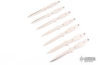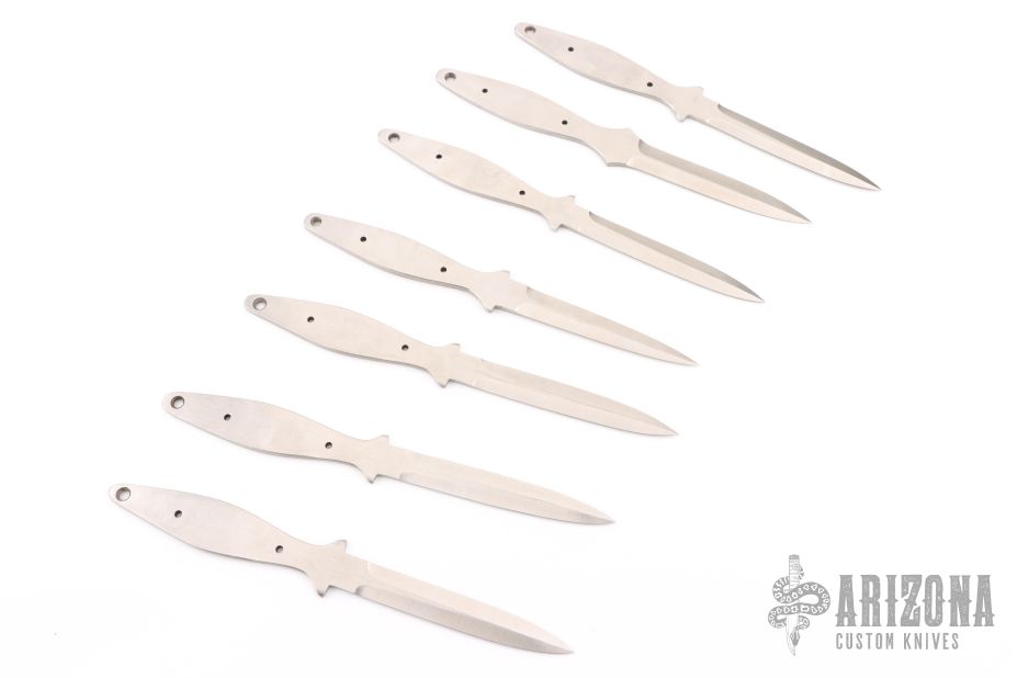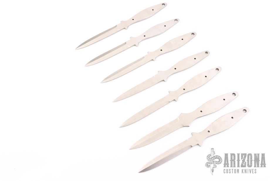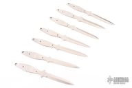 This Throwing Knife Set of Seven from Lynn Dawson features full tang construction, .128" blade stock, .604" blade depth. The blade is beveled to 4". These knives are not sharpened on purpose - Nearly sharp though! Excellent condition.