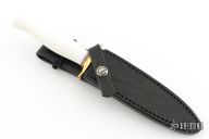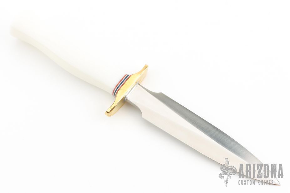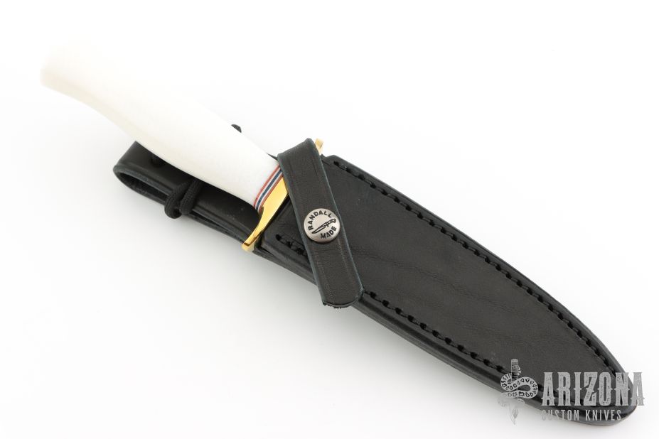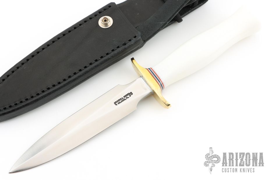 This Model 2-5 Dagger by Randall Made Knives features a double-edged satin finished blade with .192" stock and 1.052" blade depth, hidden tang construction. The handle has a brass guard with red/white/blue spacers and imitation ivory grip. Comes with a black leather sheath and original paper wrapping. New from maker.