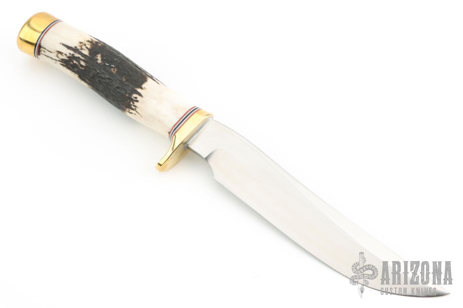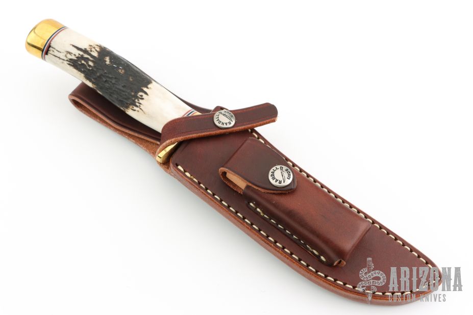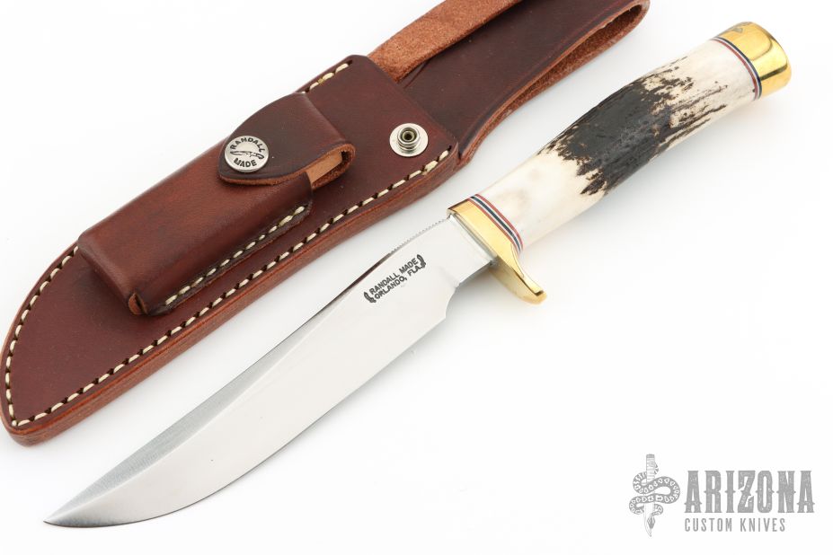 This Model 3-6 by Randall features a satin finished stainless steel blade with a false top edge and notched thumbrest, .205" blade stock and 1.078" blade depth, hidden tang construction. The handle has a brass guard and butt, stag grip with red/white/blue spacers. Comes with a brown leather sheath and original paper wrapping. New from maker.