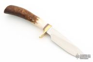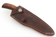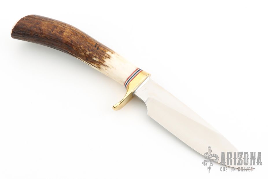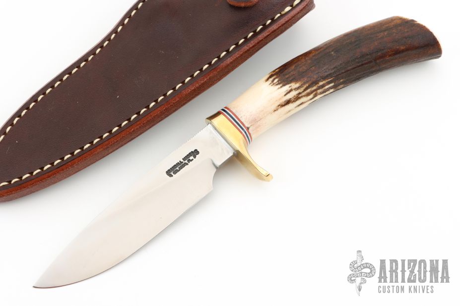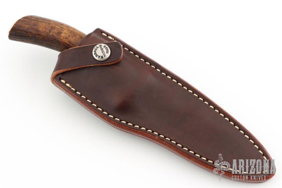 The Model 26 by Randall Made Knives is an excellent skinning and outdoors knife with drop point satin finished blade with notched thumbrest, .195" blade stock and .942" blade depth, hidden tang construction. The handle has a brass guard, stag grip and red/white/blue spacers. Comes with brown leather sheath and original paper wrapping. New from maker.