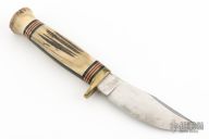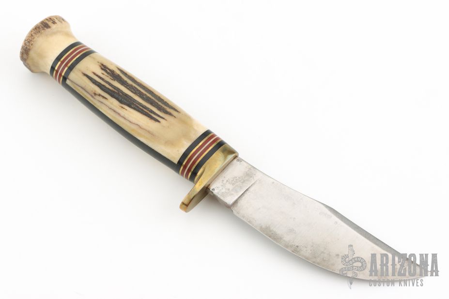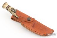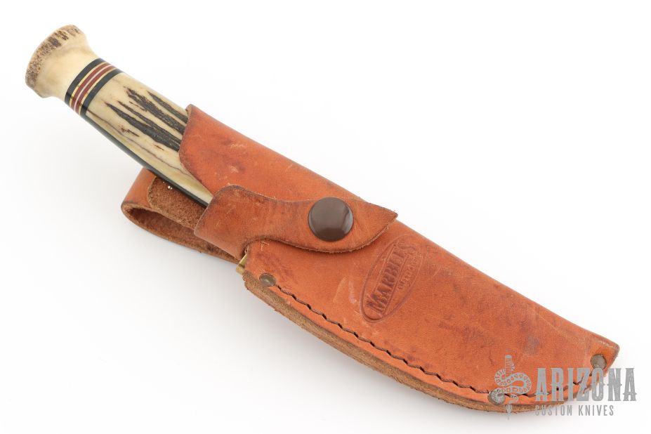 This Fieldcraft by Marbles features a satin finished blade, .178" blade stock and 1.059" blade depth, hidden tang construction. The handle has a brass guard with stag grip and black/white/brass/red spacers and stag cap. Comes with original brown leather sheath and Marbles box. Has some scuffs, scratches, and patina. Good condition otherwise.